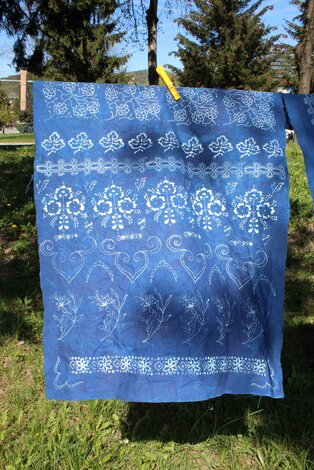 Pán Trnka účastníkom najskôr názorne ukázal postup potláčania látok. Následne si účastníci sami potlačili látku pomocou modrotlačových foriem. Po zaschnutí “papu“ sa látka niekoľkokrát ponorila do modrého roztoku tzv. kypy a nechala na vzduchu oxidovať. Vypraním v roztoku kyseliny sírovej sa odstránila pôvodná nanesená rezerva, vďaka čomu sa zvýraznili biele potlačené vzory.